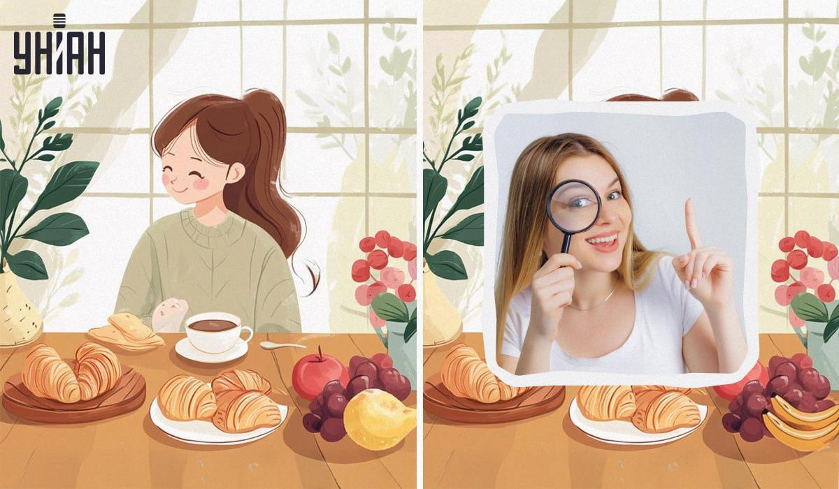 A képeken egy aranyos lány látható, amint a konyhában reggelizik. Kávét (vagy teát) iszik finom croissantok mellé. Desszertnek pedig gyümölcsöt vár. A képek szinte teljesen egyformának tűnnek, négy apró különbség van köztük. Képes leszel megtalálni őket?