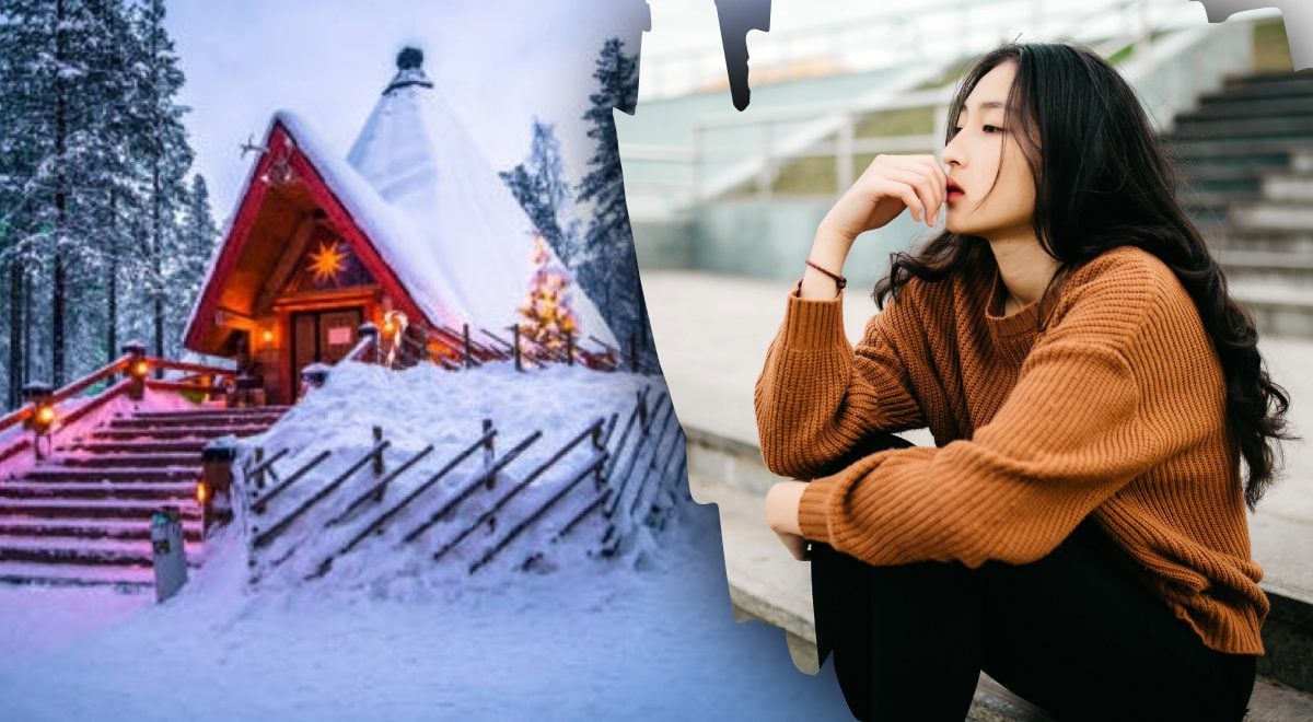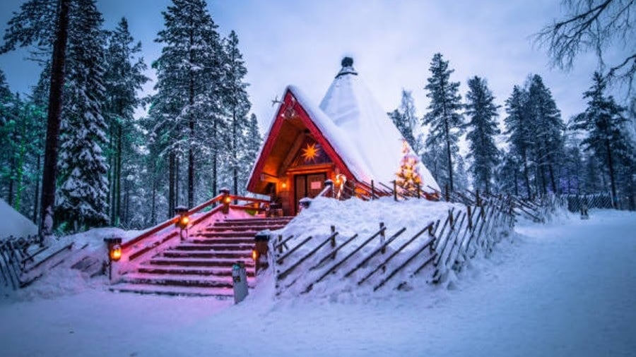 A képen egy ház látható, amelyhez egy nagy létrán kell felmásznod. A lakóház körül egy tűlevelű erdő van, a fák ágai meghajlottak a nagy mennyiségű hótól. A ház előtt fények világítanak, az egész udvart vastag hóréteg borítja, amely szinte teljesen befedi a kerítést.